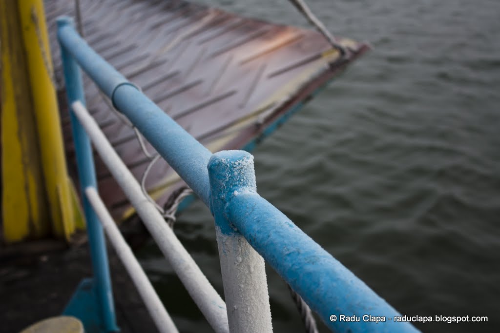 La momentul ăsta Mircea îmi mărturisea că e prima lui trecere cu bacul. Eu mai fusesem, dar nu cu mașina, ci la pas, anul trecut pe 1 mai, la un mic grătar; de asemenea mai circulasem pe Dunăre în timpul liceului, când am venit la Galați ca participant la olimpiadă și parte din programul recreativ conținea o excursie cu vaporașul. Aveam deci o oarecare vechime pe valuri :P. De data aceasta am găsit un bac mic, plin cu mașini, și înghețat