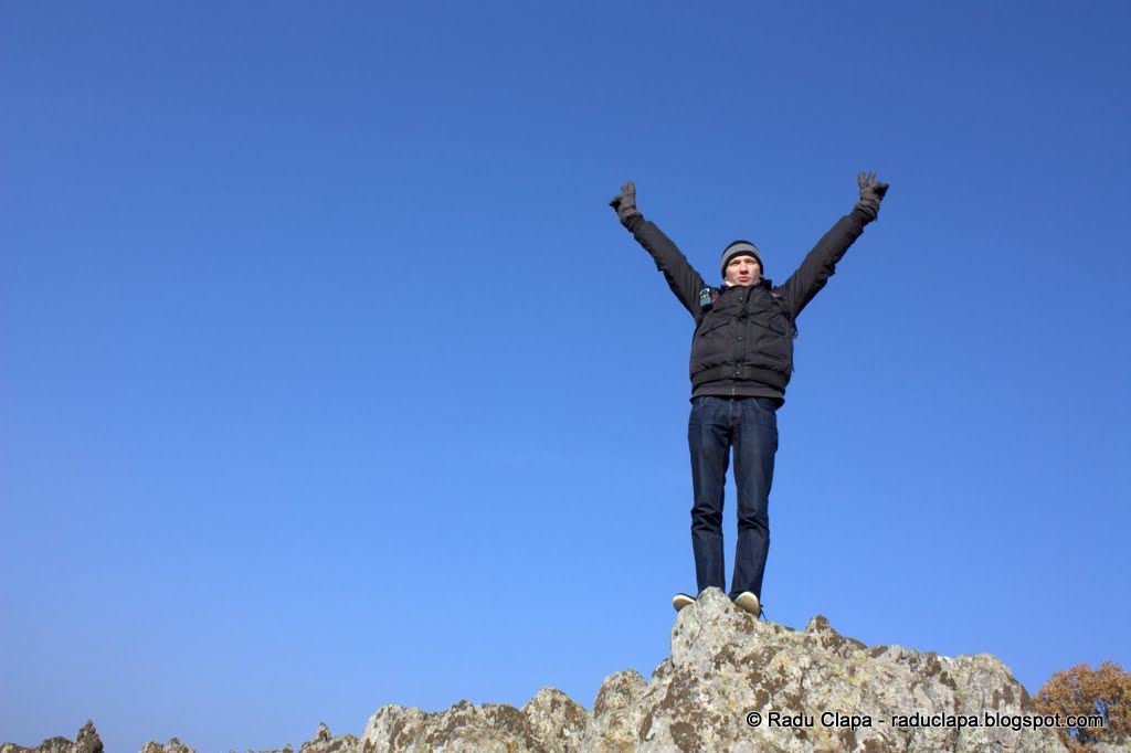 Era ora 14.23 și ne aflam la aproximativ 200m altitudine, pe ultimul vârf al acestei expediții. Mircea se cocoțase pe piatră, deci GPS-ul lui va spune că eram la 202 metri :))