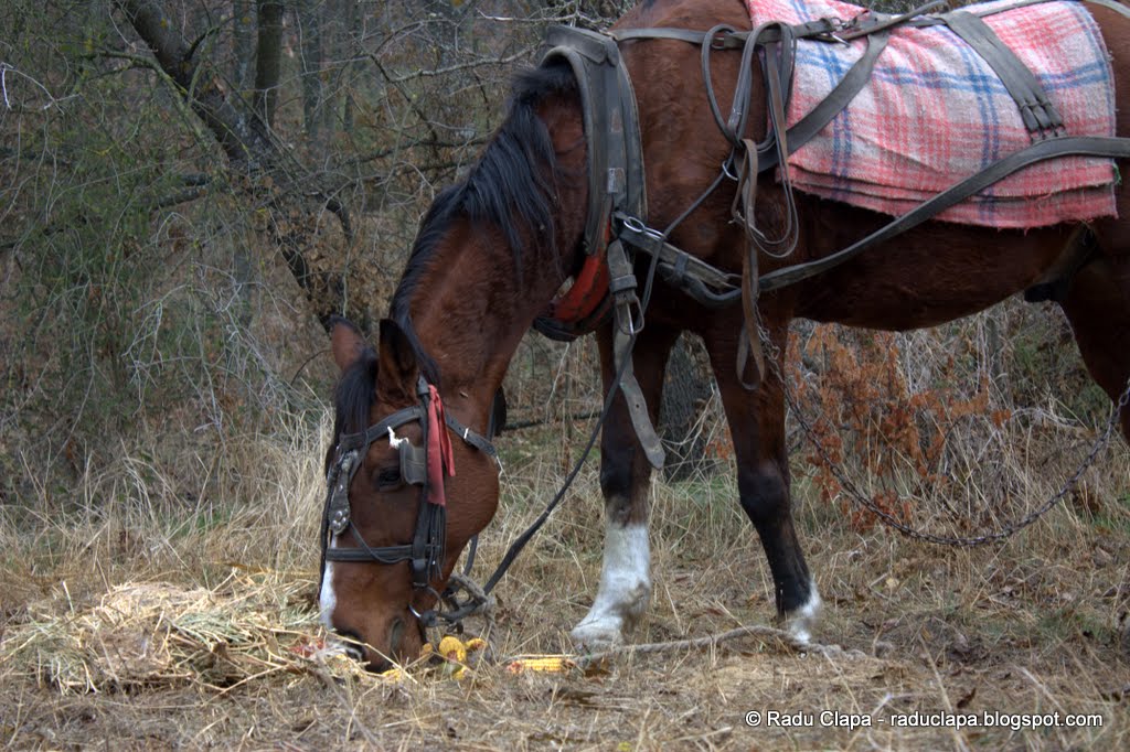 Am stat puțin și am făcut poze, unii au ciugulit rapid ceva din desagă timp în care a ajuns în dreptul nostru un căruțaș. După ce Dan a intervievat calul am aflat că suntem pe drumul cel bun și, deși nenea se oferise să ne ia în căruță, am considerat că mai degrabă mergem pe jos (căruța era pregătită pentru lemne, deci nu avea decât o plasă de sârmă în ladă).