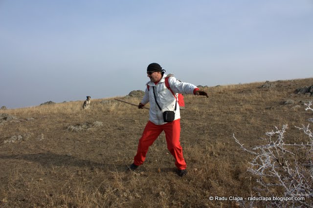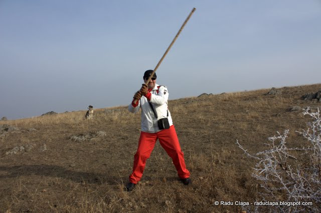 Am socializat puțin cu ciobanii (vorbesc la persoana întâi plural, referindu-mă la noi, grupul, nu eu personal 😀 ), Edi le-a oferit câte o țigară… am auzit că asta ar fi monedă de schimb pe munte… Cred și eu că pentru ei e greu să fii atâta vreme în pustiu… bunătățile aduse de turiști sunt rare delicii. Mai apoi Dan a împrumutat unul din bețele ciobanilor și a făcut o mică demonstrație de măiestrie. Trebuie să recunosc faptul că a fost destul de impresionant… fie a mai făcut dintr-astea, fie a urmărit cu mare atenție filmele cu arte marțiale…