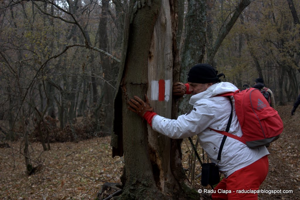 Ne aflam, cum am spus pe traseu turistic oficial, bandă roșie și îl vedem pe Dan despicând cu greu copacul în căutarea semnele de orientare….