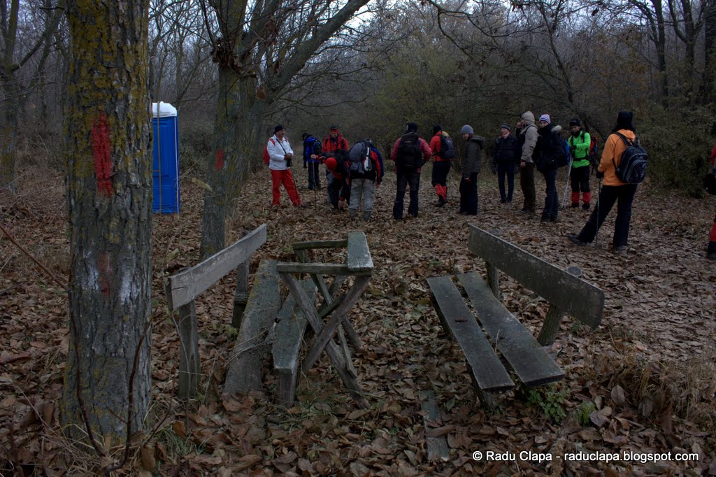 Eu am rămas puțin în urmă că am avut ceva de rezolvat, și mențineam legătura cu Mircea prin stație. Nu mă grăbeam, așa că am făcut câteva pauze foto pe drum. Când m-am regăsit cu grupul, erau toți adunați într-un loc de popas consacrat. Zic asta fiindcă găseai aici câteva bănci și mese de lemn, un coș de gunoi, un WC ecologic (cică așa se cheamă) și o colibă dezafectată.
