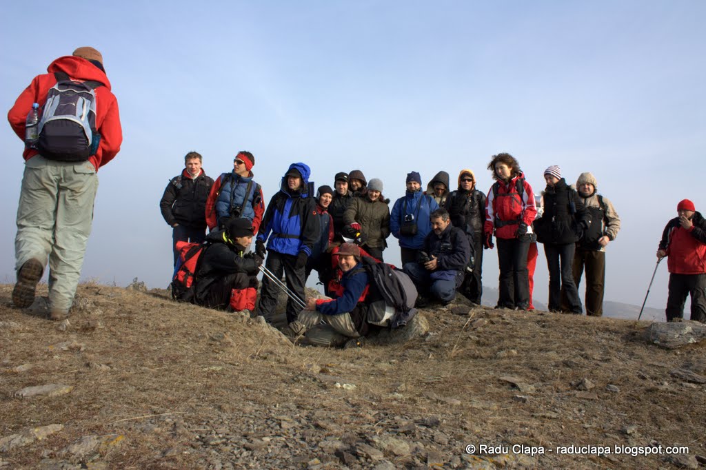 După spectacolul de arte marțiale cu bățul, am continuat ascensiunea spre vârf unde am făcut vreo două poze cu împrejurimile și poza de grup. Din păcate, nu am reușit să declanșez camera când toți erau aliniați din cauza telecomenzii, așa că singura poză de grup pe care o am e cea „de test” de mai jos…. Știți că e culmea fotbalului să dai gol dar în reluare să ratezi, ei bine la mine ironia a fost ca poza de test să iasă, iar cea bună să nu aibă loc… îmi pare rău, data viitoare, dacă vom mai face poză de grup, voi fi mai atent.
