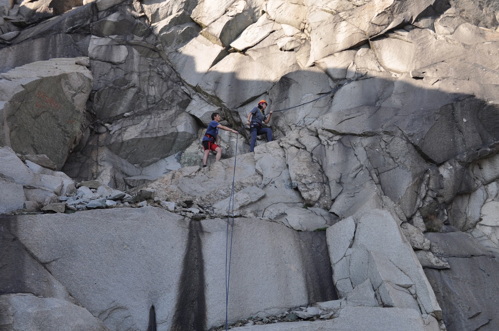 În timp ce toți s-au mutat pe traseul „Banana”, m-am suit să dezechipez traseul „Ionuț” apoi am urcat cap de coardă pe „Balcoane”, asigurat de la sol de către Dan. E un traseu foarte interesant și plăcut. Chiar dacă la început pare dificil, până la prima regrupare e destul de fain și ușurel. Zic asta fiindcă mai departe nu am reușit să ajung. De fapt, am ajuns la regrupare, am montat ancora pentru un viitor rapel, am coborât să-mi recuperez buclele (că n-aveam destule pentru tot traseul) și am revenit la regrupare pentru a continua ascensiunea.
